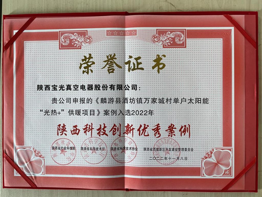 近日,陜西省社會(huì)科學(xué)院、陜西省科學(xué)技術(shù)廳、陜西省科學(xué)技術(shù)協(xié)會(huì)、陜西省西咸新區(qū)開發(fā)建設(shè)管理委員會(huì)聯(lián)合發(fā)布“2022年陜西科技創(chuàng)新優(yōu)秀案例”,寶光股份申報(bào)的《麟游縣酒坊鎮(zhèn)萬(wàn)家城村單戶太陽(yáng)能“光熱+”供暖項(xiàng)目》成功獲選高效治理高品質(zhì)生活組“陜西科技創(chuàng)新優(yōu)秀案例”。