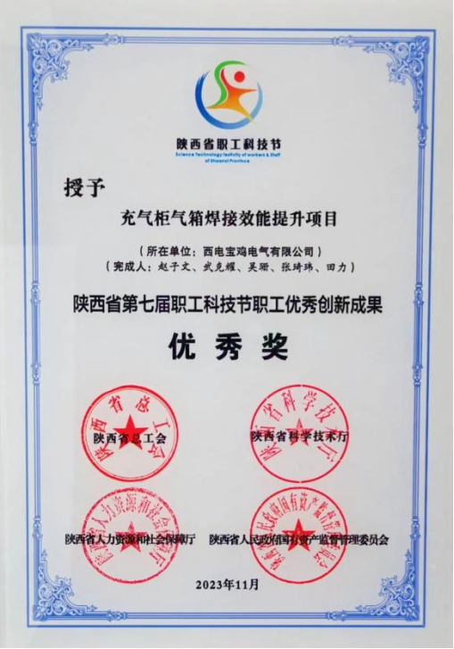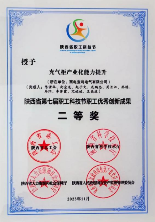 陜西省職工優秀創新成果二等獎——西電寶雞電氣 “充氣柜產業能力提升”