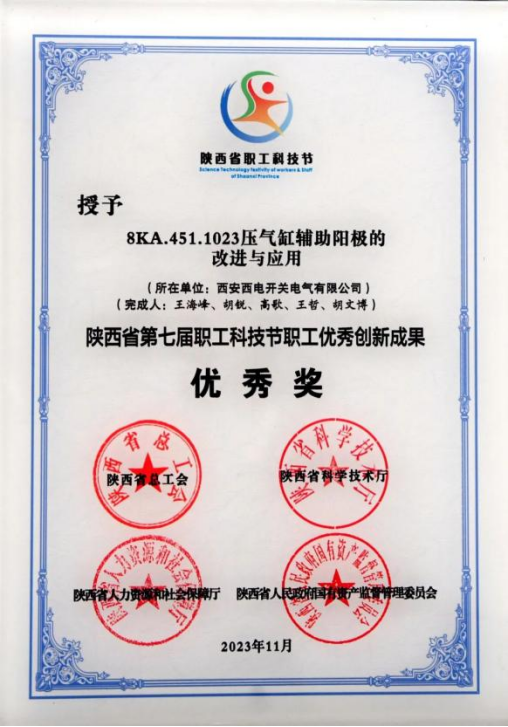 陜西省職工優秀創新成果優秀獎——西開電氣“8KA.451.1023壓氣缸輔助陽極的改進與應用”