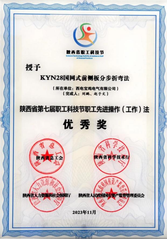 陜西省職工先進操作(工作)法優秀獎——西電寶雞電氣“KYN28國網式前側板分步折彎法”