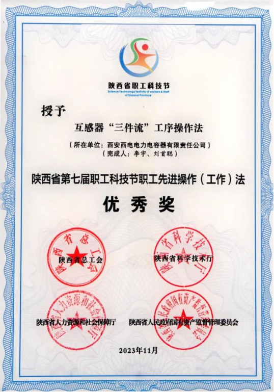 陜西省職工先進操作(工作)法優秀獎——西電西容“互感器'三件流'工序操作法”