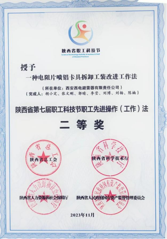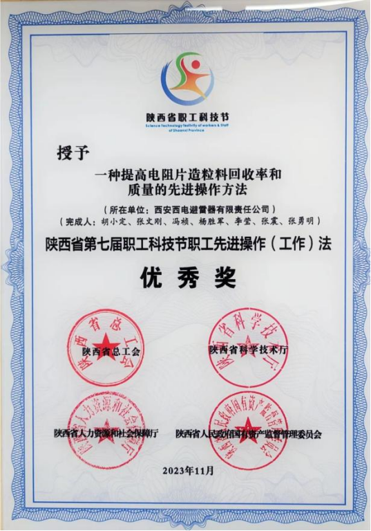 陜西省職工先進操作(工作)法優秀獎——西電避雷器“一種提高電阻片造粒料回收率和質量的先進操作方法”