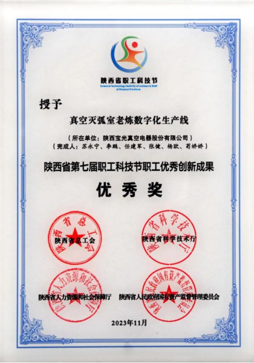 陜西省職工優秀創新成果優秀獎——寶光股份 “真空滅弧室老煉數字化生產線”